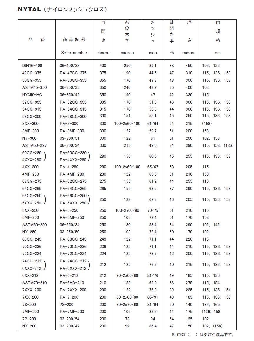( 目開き: ナイロン5 ~ 200 μm / ポリエステル 5 ~ 800 μm ) |
